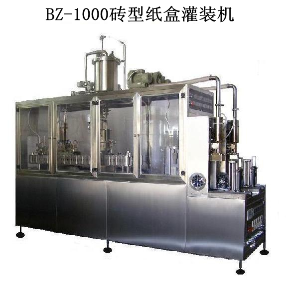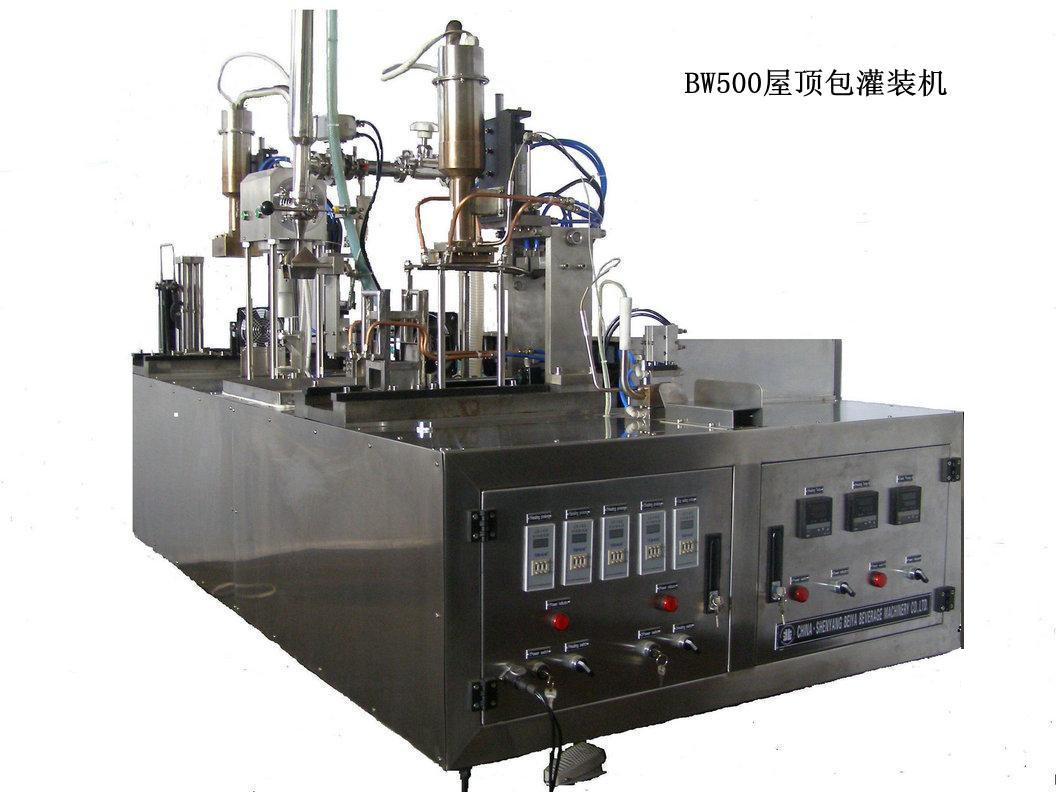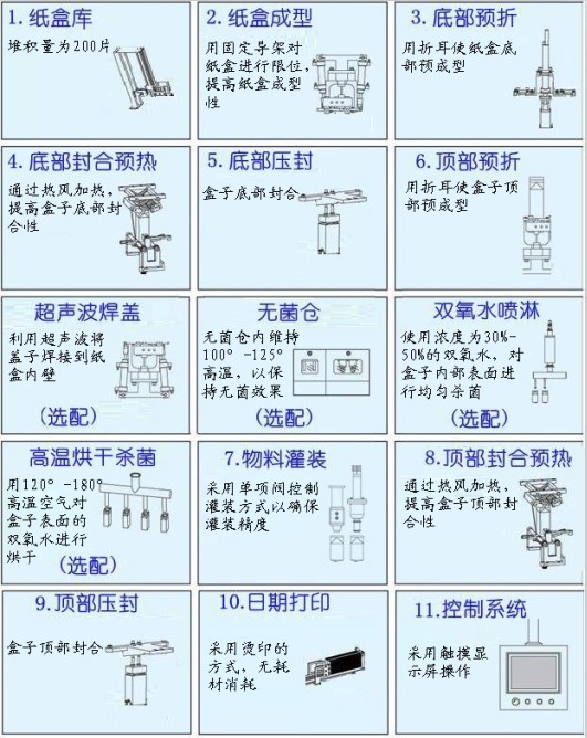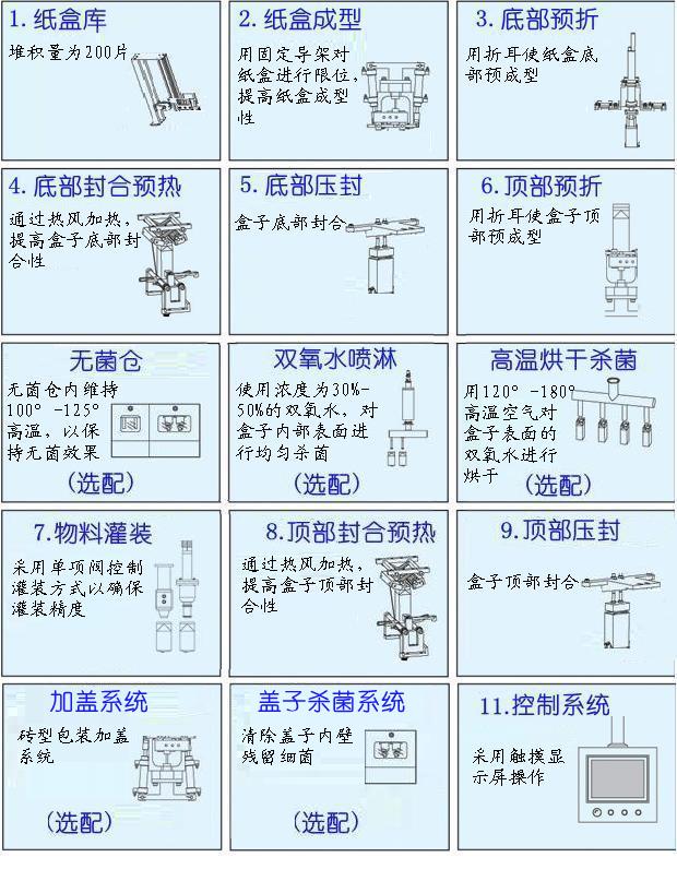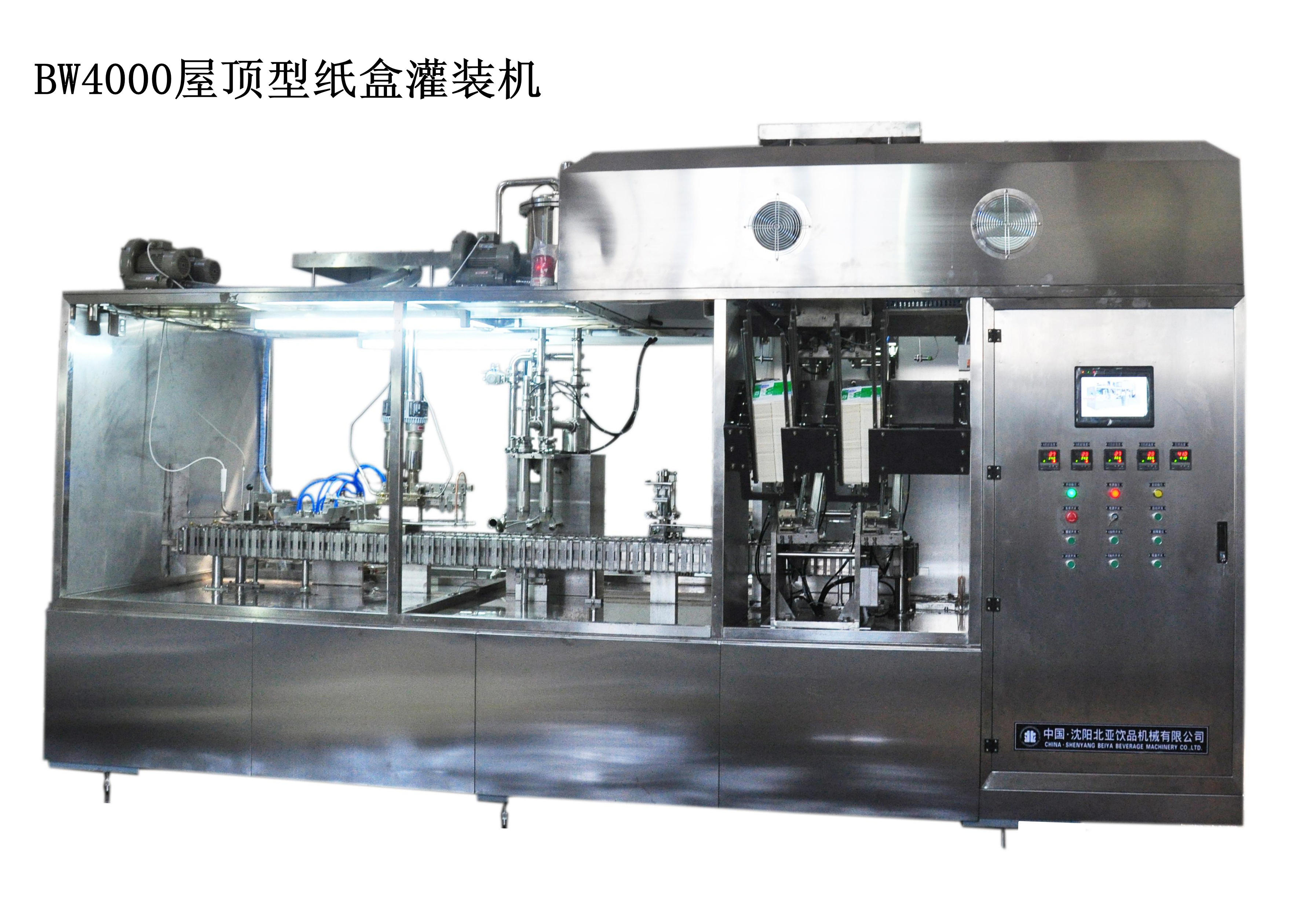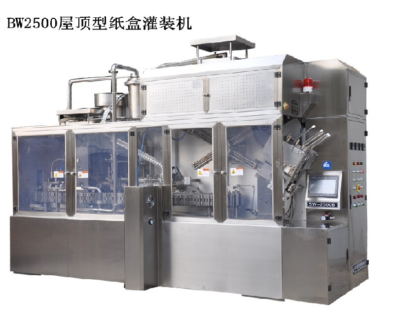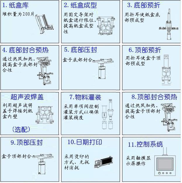 屋頂盒紙盒片→人工上盒→底部加熱壓封成型→開口紙合→超聲波焊接加蓋→開口加蓋紙盒→人工放盒至軌道→灌裝→頂部封合成型→打印日期→磚包產品